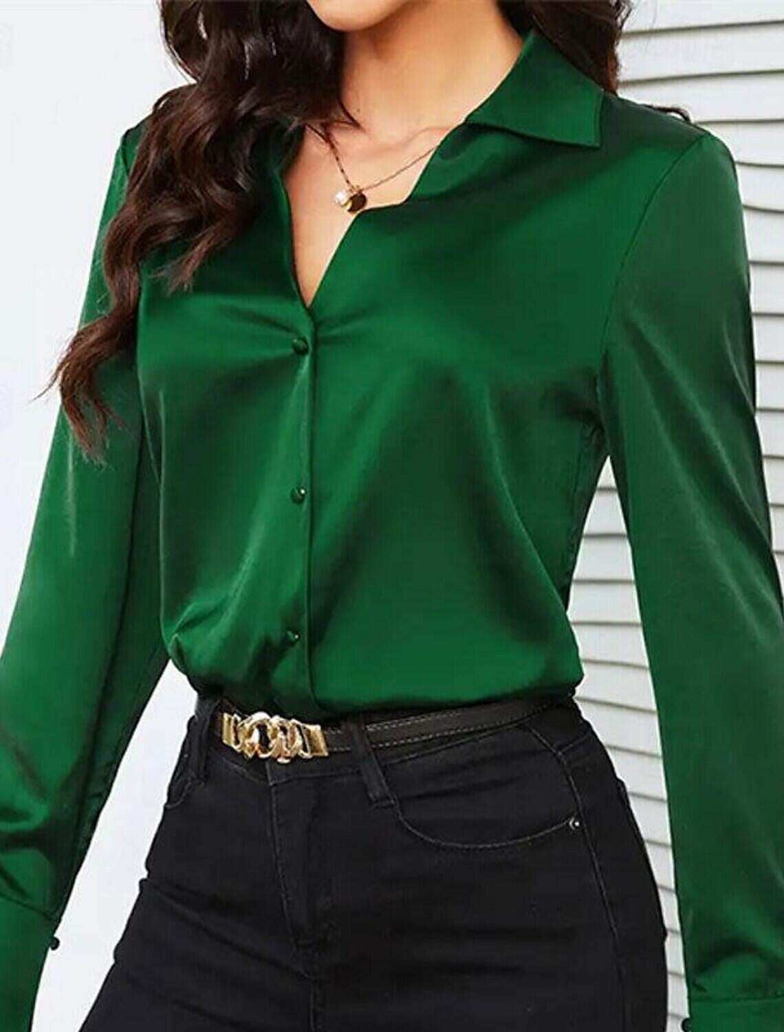 [Design Highlights] Featuring a classic button-down design with a refined shirt collar, this blouse includes long sleeves equipped with buttoned cuffs. The plain green hue provides a versatile backdrop, making it easy to pair with other wardrobe staples.