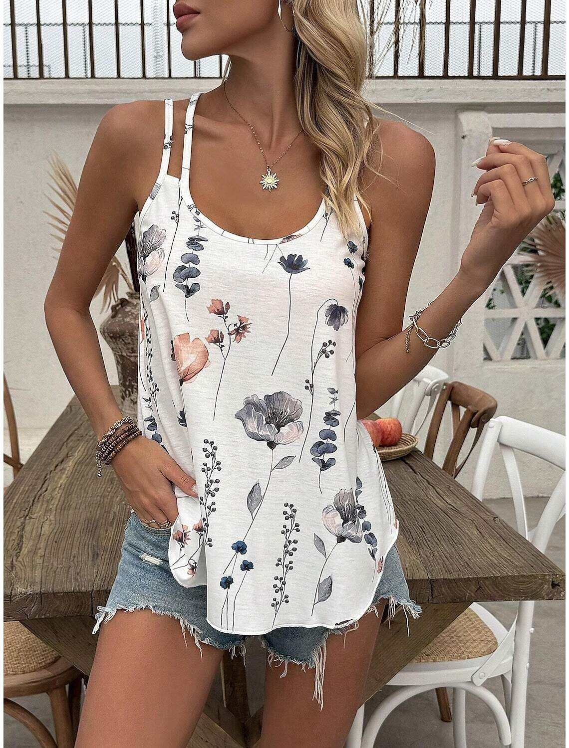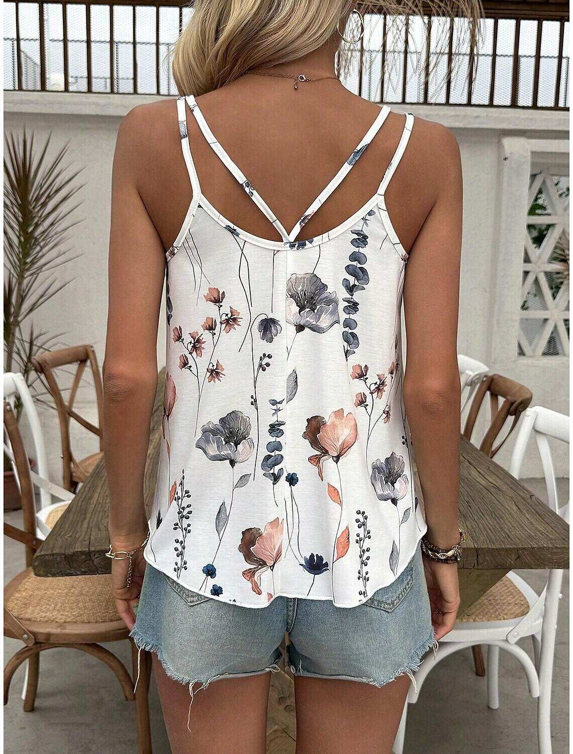 [Design Highlights] Featuring a charming floral print, this tank top includes a V-neckline and double spaghetti straps, adding both elegance and a boho-chic flair to the design. The nature-inspired floral pattern enhances the top's femininity and charm, making it a staple piece for any summer wardrobe.
