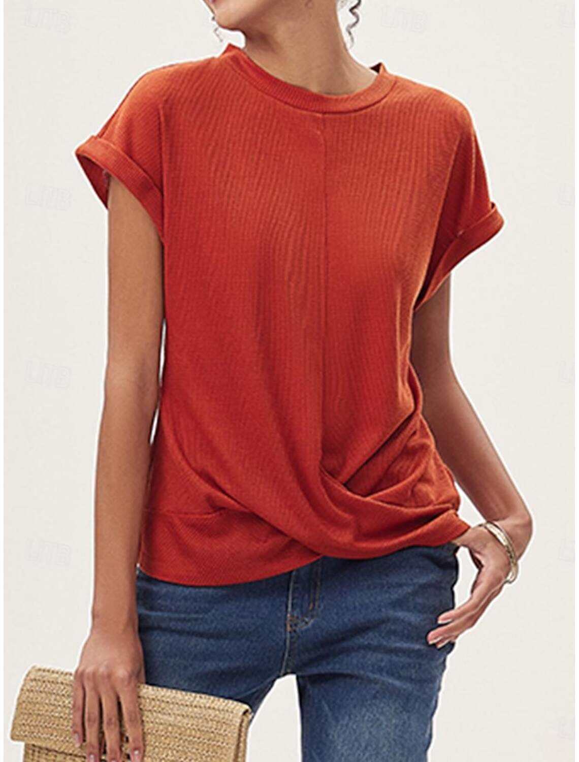[Design Highlights]: The top features a classic crew neckline and short sleeves with a subtle rolled-up edge, combining a simple elegance with a relaxed vibe. Its twisted design adds a unique touch, enhancing its casual yet chic appeal.
