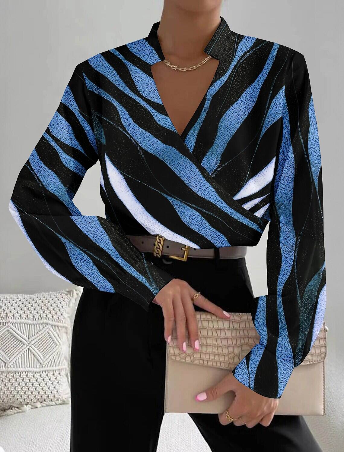 [Design Highlights]: Featuring a bold black and gold zebra print, this blouse exudes a fashion-forward aesthetic. The chic V-neckline and wrap-style front enhance the silhouette, creating a flattering look that adds a touch of modern elegance to your ensemble.