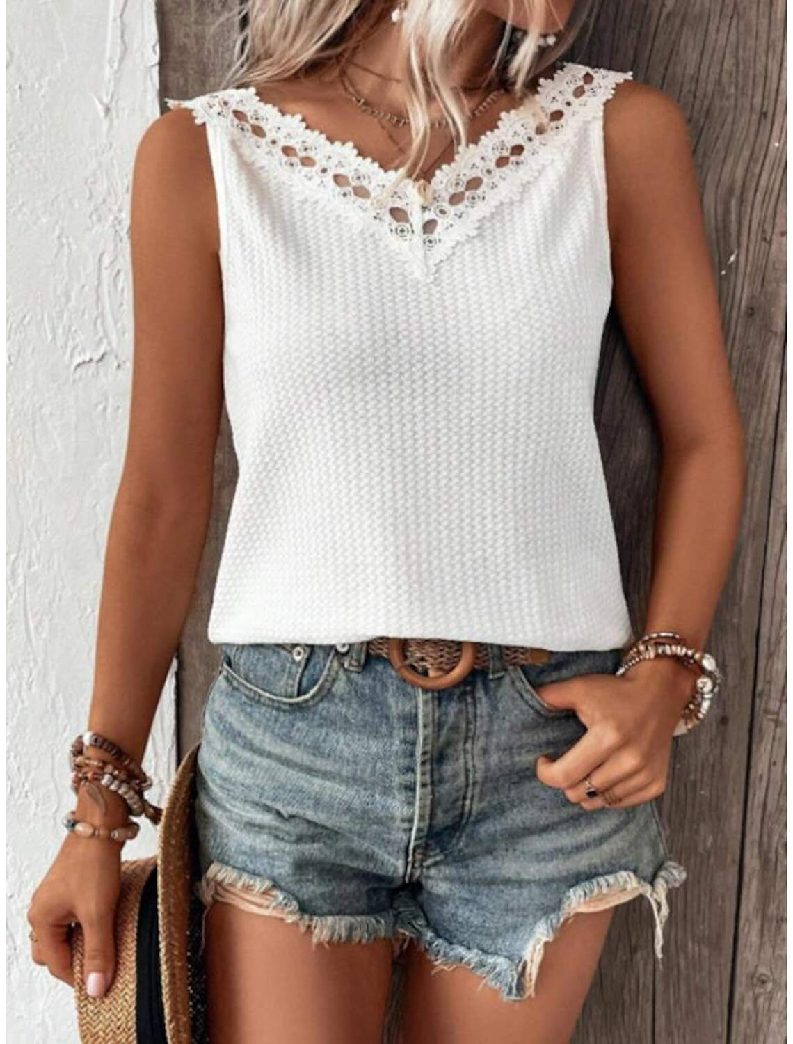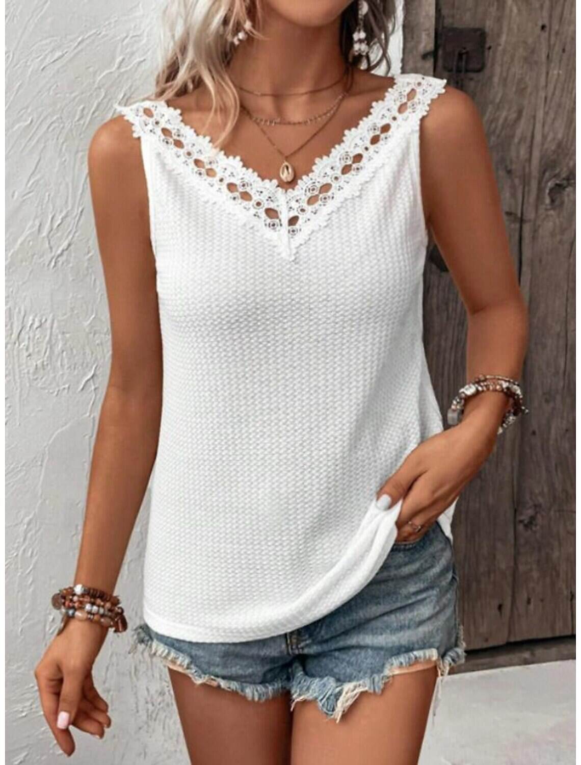 Experience the comfort of summer with this Women's Sleeveless V-Neck Top, crafted from lightweight polyester that is breathable and perfect for warm-weather wear. The fabric's textured knit and intricate lace eyelet details add a touch of sophistication and feminine charm.