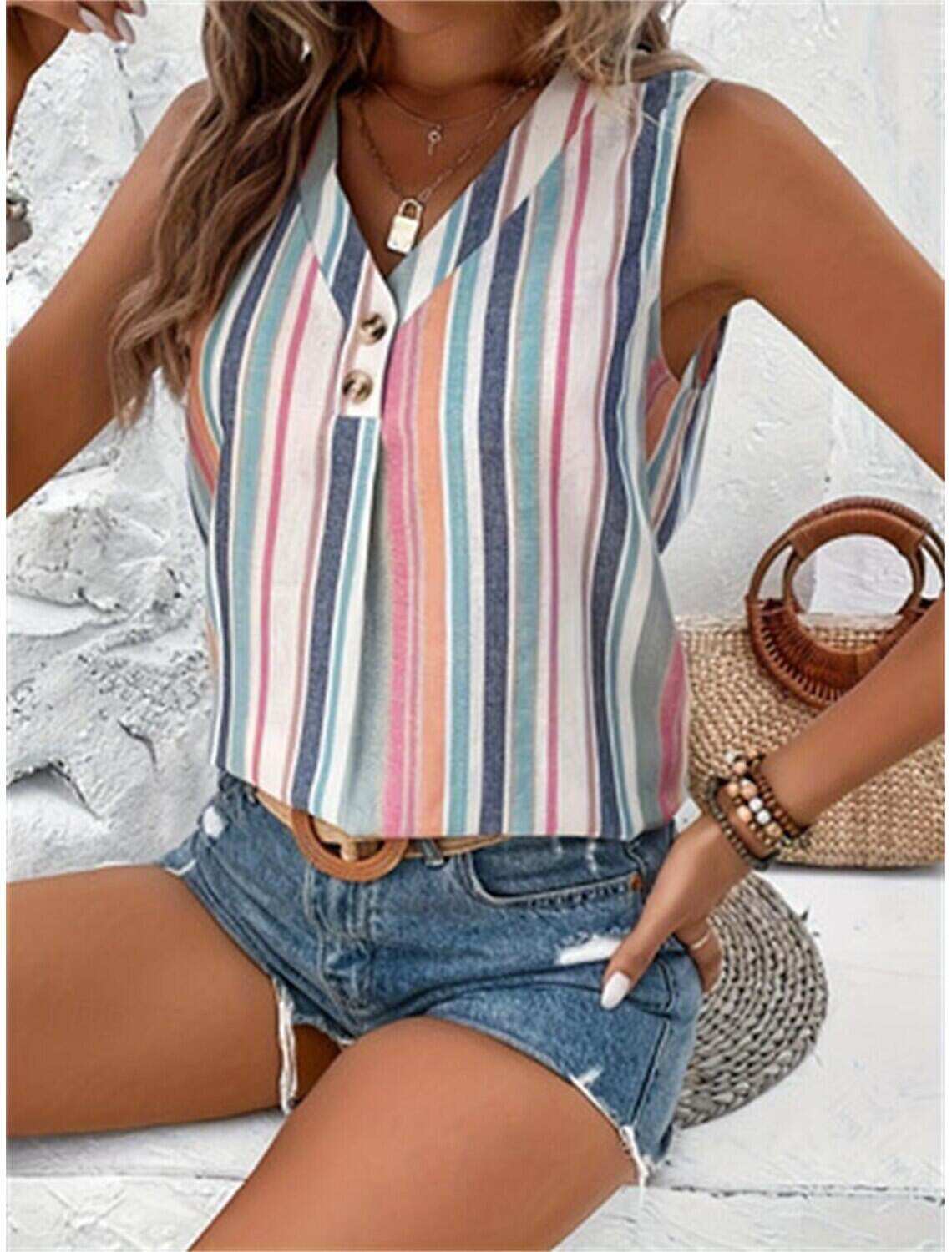[Design Highlights]: The tank top is adorned with a vibrant multi-colored vertical stripe pattern that adds a lively touch to your summer wardrobe. Decorative buttons along the V-neckline introduce an element of elegance to this casual piece, while the 3D print technology gives the stripes a vivid and unique appearance.