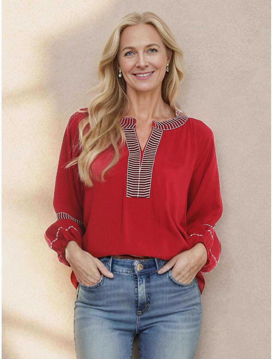 [Design Highlights]: This designer shirt features a sophisticated V-neckline and long sleeves with elasticized cuffs for a versatile and fashionable appearance. Intricate striped and color block patterns, along with embroidered detailing on the neckline, cuffs, and front placket, add a touch of elegance and bohemian style.