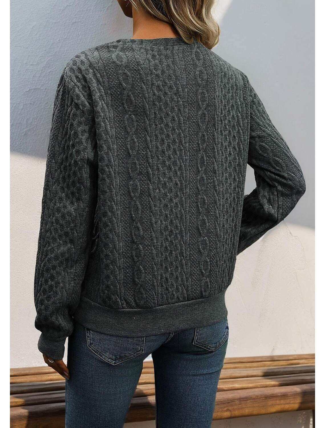 [Design Highlights] The tunic incorporates a unique asymmetrical button design on the chest, enhancing its modern appeal. The classic cable knit pattern introduces a timeless element, while the dark gray color adds sophistication and complements various styles.
